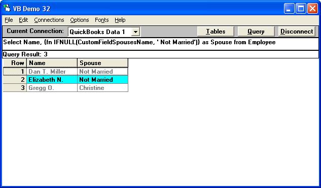 Select Name, {fn IFNULL(CustomFieldSpousesName, ' Not Married')} as Spouse from Employee