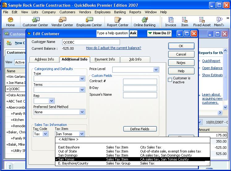 All customer records contain both a sales tax code and a sales tax item. When you create a new customer, assuming you opted to make customers taxable, the sale tax code Tax is automatically applied, and the sales tax item you specified in the Most Common Sales Tax Item in the Sales Tax Preferences dialog is also automatically applied.