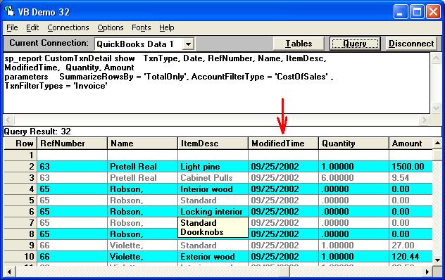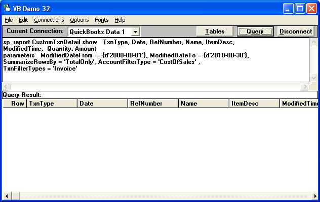 sp_report CustomTxnDetail show TxnType, Date, RefNumber, Name, ItemDesc, ModifiedTime, Quantity, Amount parameters ModifiedDateFrom = {d '2000-08-01'}, ModifiedDateTo = {d'2010-08-30'}, SummarizeRowsBy = 'TotalOnly', AccountFilterType = 'CostOfSales' , TxnFilterTypes = 'Invoice'