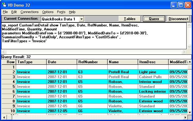 SQL Statement: sp_report CustomTxnDetail show TxnType, Date, RefNumber, Name, ItemDesc, ModifiedTime, Quantity, Amount parameters ModifiedDateFrom = {d'2007-08-01'}, ModifiedDateTo = {d'2007-08-30'}, SummarizeRowsBy = 'TotalOnly', AccountFilterType = 'CostOfSales' , TxnFilterTypes = 'Invoice'
