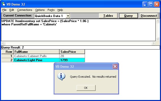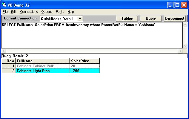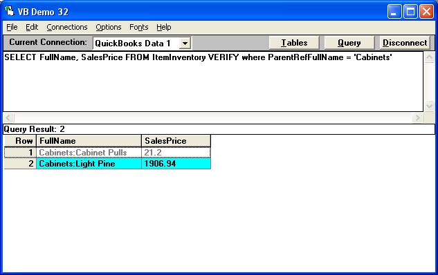 SELECT FullName, SalesPrice FROM ItemInventory VERIFY where ParentRefFullName = 'Cabinets'