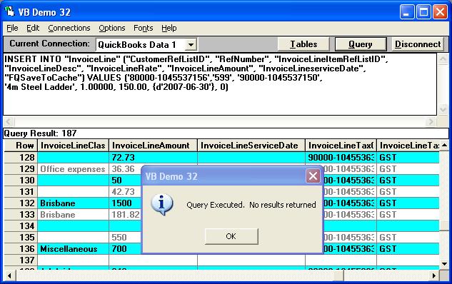 I'm attempting to add an item (invoiceline)  to the invoiceline table using QB Pro 2005 and v7.00.00.207 of the QODBC driver.