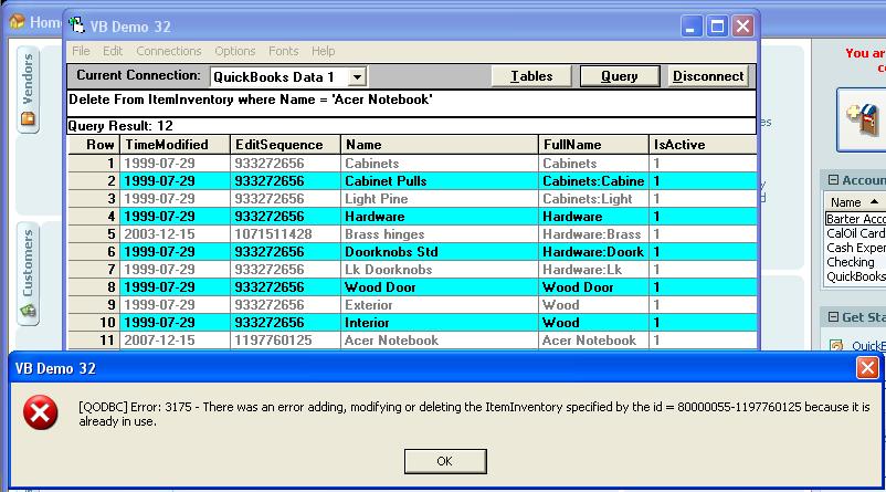 I need to delete many (800+) items from the inventory of our QB-Pro 2004 data file.  I use Vis. Foxpro v6.0 to connect using QODBC v7.  When I try some manual SQL statements to Delete or even to Delete and Insert, the result set looks good in Vis Foxpro but when I close that and go into QB I still see the original record.